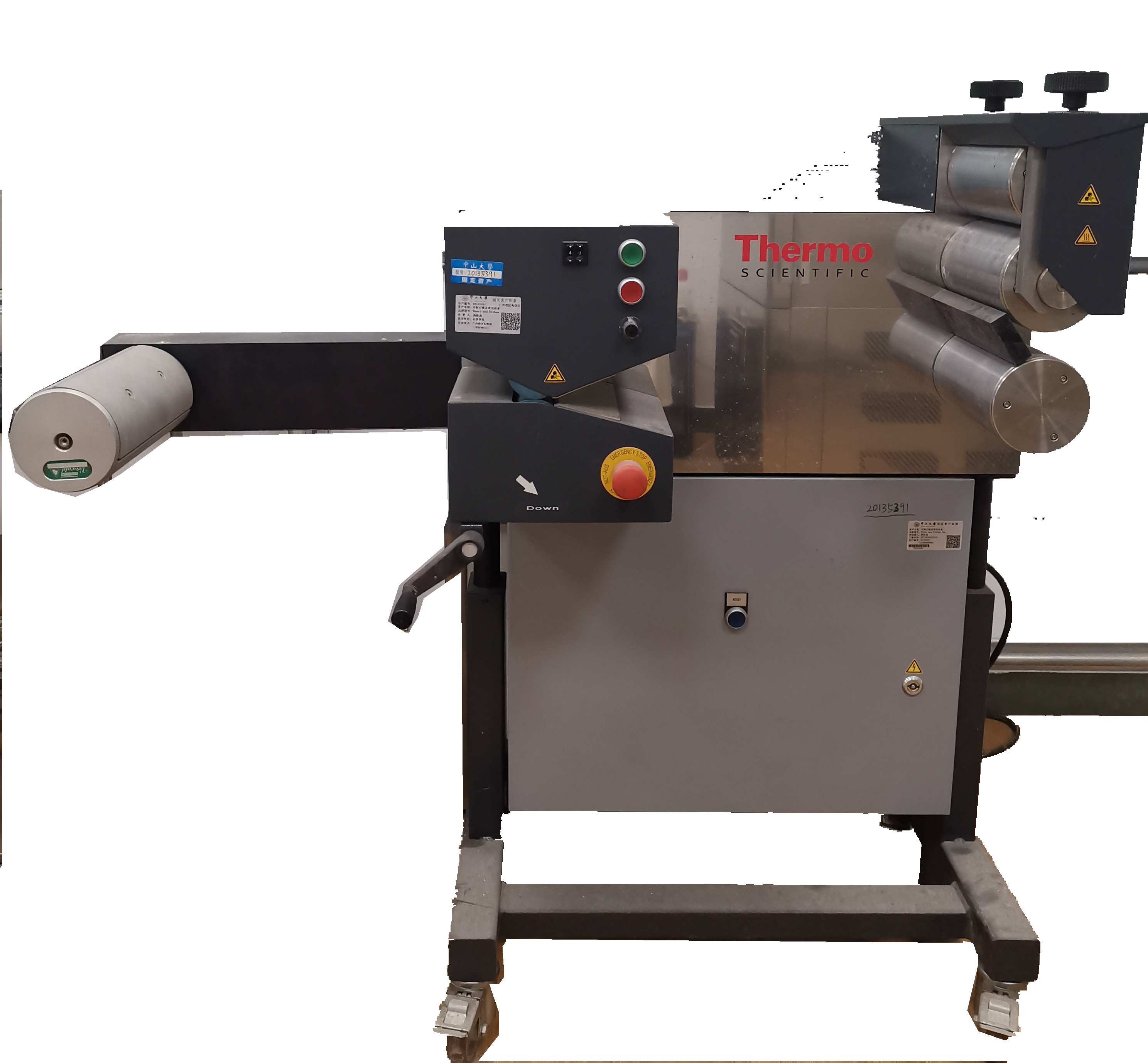 | 主要参数 牵引速度:0-10m/min,200℃辊子直径:110mm,辊子宽度:200mm; 辊子表面 镀铬——高度抛光; 最高温度 200℃,脱离速度:0—10m/min; 主电源:220V+/-10%, 50-60Hz,最大电流 6A; 尺寸(长/ 宽 /高):570/1130/720mm; 重量 165Kg。 |