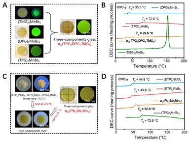 图4. 多组分有机-无机杂化金属卤化物玻璃及其热力学特性