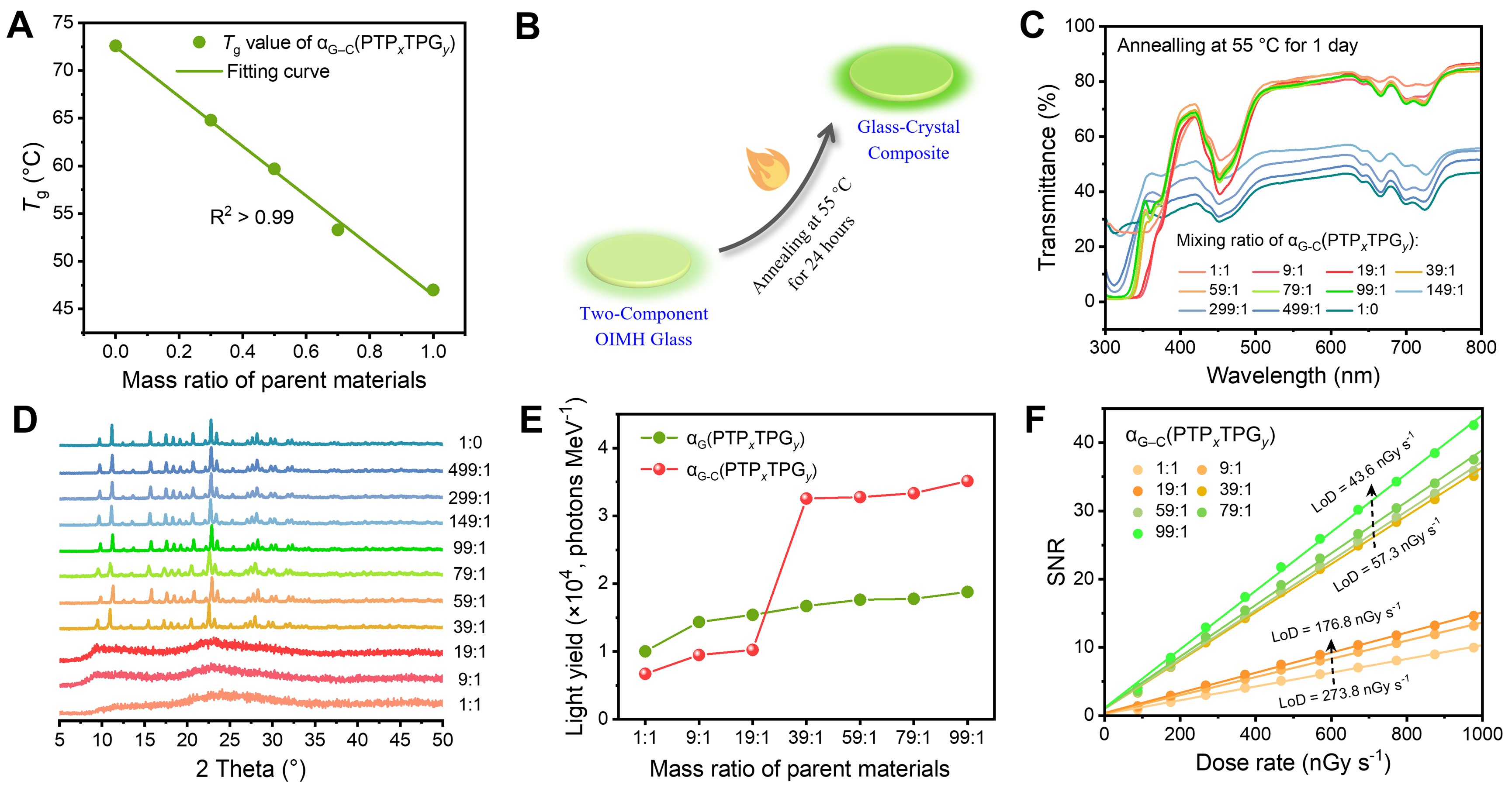 近日,匡代彬教授团队提出了一种普适性双组分策略,通过调控熔体的无序度来抑制结晶,为有机-无机杂化金属卤化物材料的玻璃化提供通用解决方案。研究团队以具有高玻璃形成能力的(TPG)₂MnBr₄(TPG+=三苯基胍)为关键组分,分别与多种A2MnBr4材料(A=三苯基膦、胍、咪唑、吡啶或季铵/膦盐)共熔,实现一系列双组分有机-无机杂化金属卤化物玻璃(αG(AₓTPGᵧ))的可控制备(图1)。随后,通过退火处理,成功将非晶玻璃转化为透明玻璃-晶体复合材料(αG–C(AₓTPGᵧ)),发光性能得到显著提升。例如,αG-C(PTP99TPG1)(PTP+=丙基三苯基鏻)在55 ℃退火1天后,光产率提升近一倍(18800→35140 photons MeV-1),检测限低至43.6 nGy s-1(X射线诊断标准剂量为5.5 μGy s-1)(图2),并且在高分辨率静态以及动态X射线成像展现了优异的应用潜力(图3)。此外,研究团队进一步将该策略扩展至多组分有机-无机杂化金属卤化物玻璃体系,包括多组分有机阳离子或金属离子(图4)。该工作建立的通用双组分/多组分策略,将激发对高性能有机-无机杂化金属卤化物玻璃的进一步探索,并推动其在先进光子学的多种应用,如闪烁体、光纤、发光二极管和激光晶体。