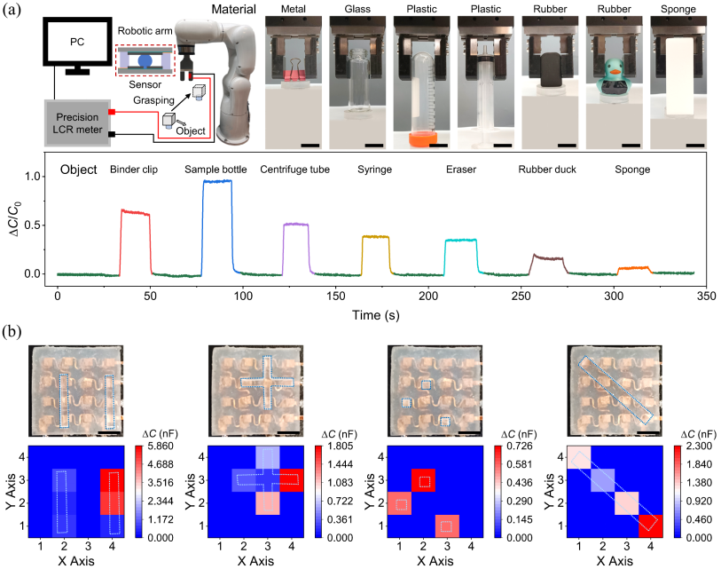 在应用层面,研究团队对液滴与水凝胶两类器件进行了初步验证。液滴传感器被集成于机械臂系统,实现了接触压力的实时监测及不同软硬程度物体的区分(图2(a));而基于水凝胶的器件则构建了4 × 4压力传感阵列,用于二维压力分布成像(图2(b))。该研究将离子电导率与激励频率明确为影响离电式压力传感器性能的重要调控参数,并建立了相应的定量分析框架,为相关器件的设计与性能优化提供了新的分析视角与实现路径。