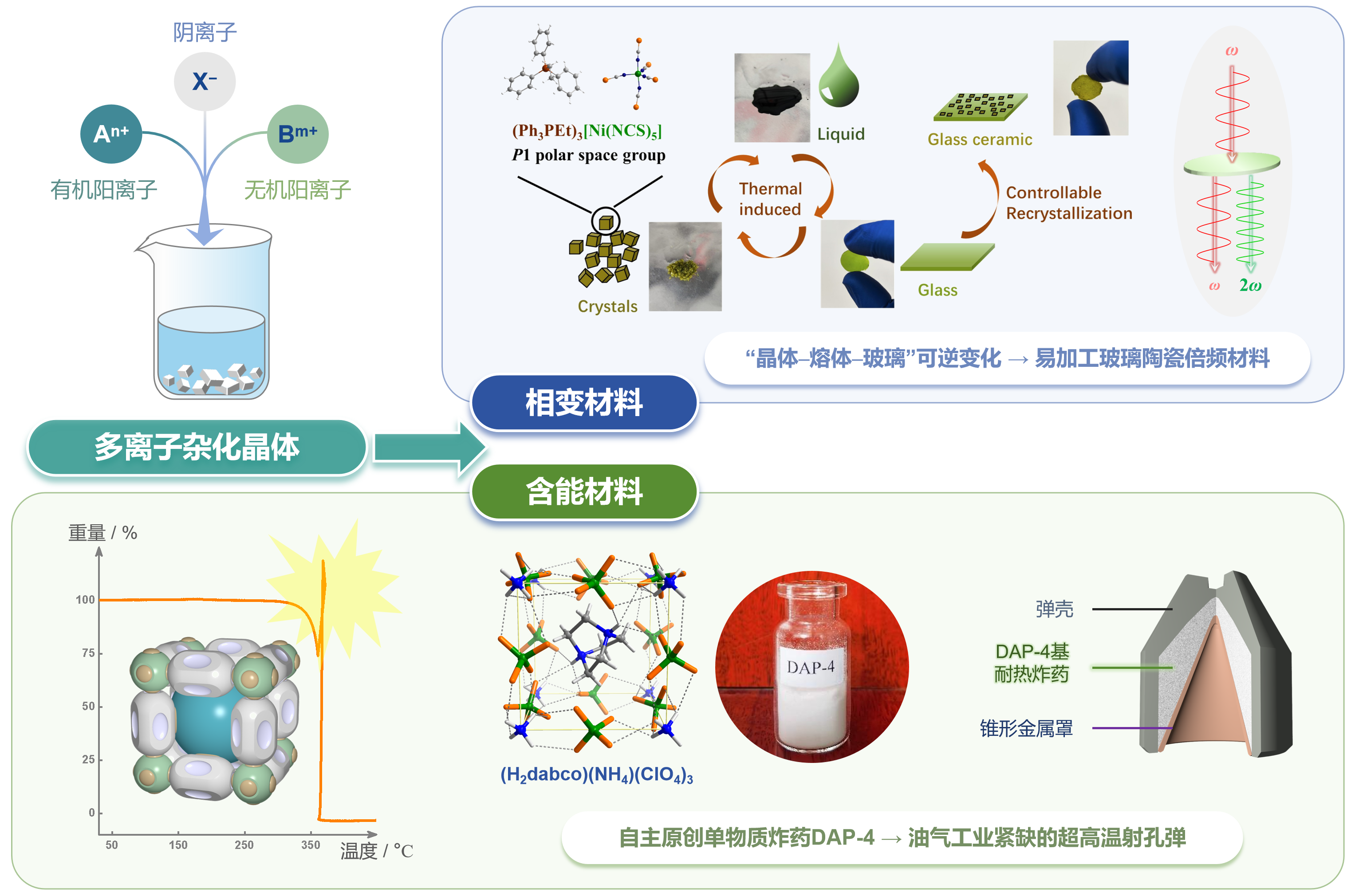 多离子杂化晶体组装及其新材料开发。兼合“有机阳离子-无机阳离子-阴离子”定向设计与可控组装,发展离子间协同调控方法开发多离子集成材料。前期主攻高性能杂化铁电体、易加工玻璃陶瓷倍频材料等,期间发现并系统研究高能、稳定、易规模化制备、具有重大军民两用潜力的多离子集成含能材料(如高氯酸铵三乙烯二铵DAP-4);通过建立其“赋能创制 - 按需调控 - 应用转化”全链条研究体系,为含能材料研究领域开辟了新方向。以第一发明人获国内外授权发明专利20余件;已发表论文160余篇,引用~1.2万次,H指数58。 Researcher ID: D-3365-2011 (//www.webofscience.com/wos/author/record/D-3365-2011)