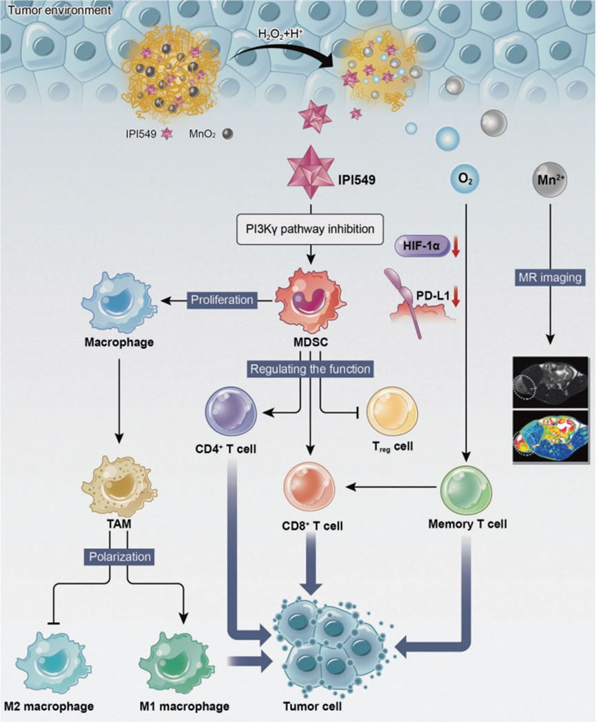 孙逸仙纪念医院沈君教授课题组,开发了一种包含MnO2颗粒和小分子IPI549的多功能纳米调节剂,它可以重塑肿瘤免疫微环境 (TIME) 以释放免疫系统。通过静脉给药的纳米调节剂能有效地积聚在肿瘤部位,通过氧化还原 MnO2 来缓解缺氧,并通过IPI549在肿瘤微环境 (TME)中的释放抑制MDSC上调的PI3Kγ,这使得在 PD-L1表达的同时下调肿瘤相关巨噬细胞针对促炎性M1 样表型的极化(TAMs)(肿瘤抑制),增强CD4+辅助T淋巴细胞(Th细胞)和细胞毒性 CD8+T淋巴细胞(Tc 细胞)的浸润,并抑制调节性T淋巴细胞(Treg 细胞)的浸润以有效肿瘤免疫治疗。此外,TME 中 Mn2+的局部生成可以使肿瘤部位产生特异性磁共振成像 (MRI)。此外,由于缺氧的缓解以及MDSC PI3Kγ 抑制的协同作用,纳米调节器重塑的TIME能被机体有效保留,在动物实验研究中在用药后能有效地抑制肿瘤再生长和转移。