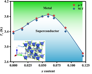尖晶石结构化合物凭借诸如庞磁阻、巨克尔旋转、磁致伸缩等异常丰富的物理性质吸引了科学家们的研究兴趣。尽管目前已发现了上千种具有尖晶石结构的化合物,但其中仅有CuRh2Se4、CuRh2S4、CuV2S4、Li1+xTi2-xO4、CuCo2S4五种母体材料,Cu1-xZnxIr2S4、Cu(Ir1-xPtx)2Se4电子掺杂材料及MgTi2O4薄膜材料表现出超导电性。CuIr2S4化合物在230 K附近出现的金属-绝缘体转变并伴随着复杂的结构转变、电荷有序态的出现以及金属-金属配对。这一金属绝缘体转变(MIT)现象在Cu1-xZnxIr2S4可以被Zn掺杂取代Cu原子抑制并同时引起其超导转变温度的提升,在x = 0.3时超导转变温度达到最大的3.4 K。与CuIr2S4化合物具有相似晶体结构的CuRh2Se4没有出现MIT现象,是最早被发现存在超导电性(Tc » 3.5K)的尖晶石硫硒化合物之一。而且,人们发现CuRh2Se4系统的超导转变温度可以在6.5GPa的压力下被提升至4.9 K。在更高压强下电阻率曲线中出现了宽峰,此宽峰可能是由于超导体-绝缘体转变导致。这意味着尽管CuRh2Se4中没有电荷顺序或金属-金属配对,但由于外部干扰CuRh2Se4可能接近某种不稳定性。因此,利用化学掺杂CuRh2Se4母体,我们可能诱导调制出新的物性或提高其超导电性。