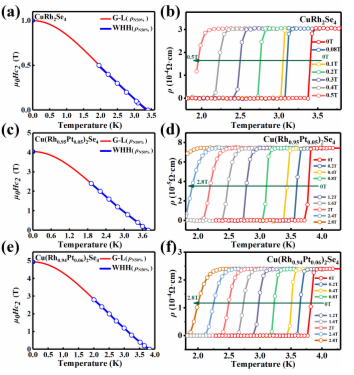 近期,罗惠霞课题组选用铂元素掺杂进入母体CuRh2Se4中,成功获得Cu(Rh1-xPtx)2Se4掺杂体系。进一步通过电导率、磁化率测量手段,证实Cu(Rh1-xPtx)2Se4系统的超导转变温度首先随着铂元素掺杂量的提升先增后降,形成穹顶状的电子掺杂相图(如图1所示)。同时,本课题组还对Cu(Rh1-xPtx)2Se4系统的临界磁场进行了系统的研究。研究发现在掺杂前后体系的下临界磁场没有太大变化,但少量Pt的电子掺杂可以数倍提升其上临界磁场,如由母体的0.6 T(x = 0, CuRh2Se4)提升到4.95 T(x = 0.06, Cu(Rh0.94Pt0.06)2Se4),大大提升了其实用价值(如图2所示)。
