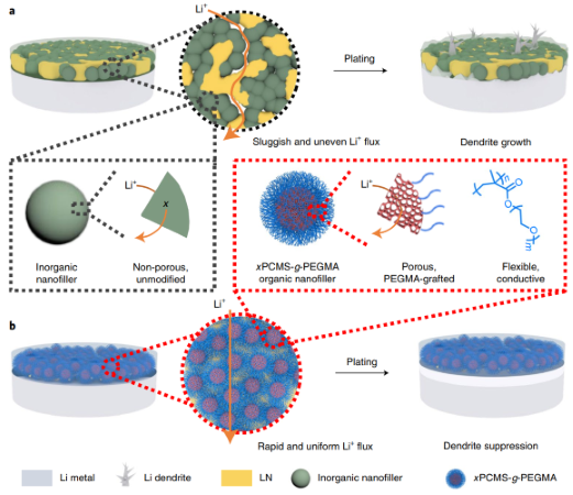 锂金属—电解液界面通常组分不均一且稳定性差,容易引发不可控的锂枝晶生长,并迅速降低电池的循环稳定性,从而严重阻碍锂金属电池的实际应用。有鉴于此,日本三级片 吴丁财教授和刘绍鸿副教授等人最近通过多孔高分子刷(超交联聚4-氯甲基苯乙烯纳米球表面接枝聚(低聚乙二醇)甲基丙烯酸甲酯,简称为xPCMS-g-PEGMA)与单离子导电锂化Nafion树脂的合理集成,发展了一种坚固的全有机人工界面保护层,由此获得了高效的无枝晶锂金属负极。具有刚性超交联骨架的多孔xPCMS内核不仅显著提高了人工保护层的机械强度,还可提供快速的锂离子传输通道;与此同时,柔性的PEGMA 侧链以及锂化Nafion树脂有利于形成结构稳定、锂离子扩散均匀且锂离子迁移数高的人工保护层。在该人工固体电解质界面层的保护下,锂金属负极可在10 mA cm-2的超高电流密度下实现超过9100小时(>1年)的超长稳定循环,并在10 mAh cm-2的大面容量下实现超过2800小时的稳定可逆锂沉积/剥离。进一步地,当与高载量正极(~4 mAh cm-2)配对时,受保护的锂负极也显示了出色的电池稳定性,说明实际应用前景广阔。