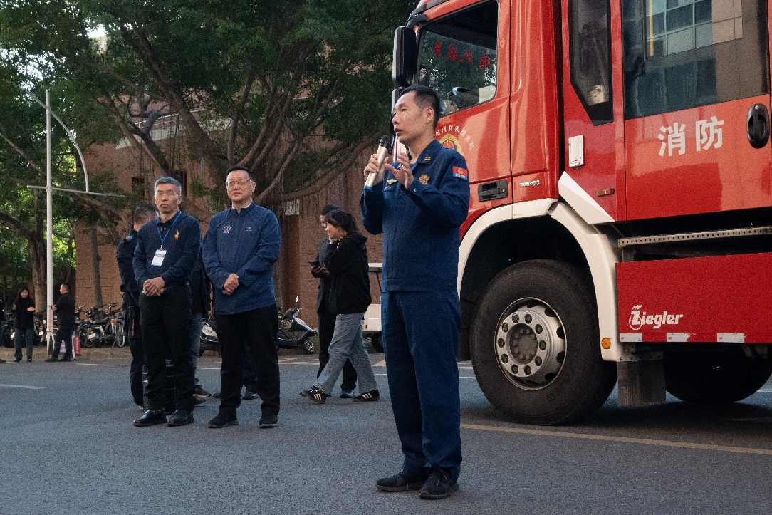 疏散演练结束后,广州市番禺区消防救援大队大学城救援站指导员徐勃作总结发言,感谢学校、学院高度重视实验室安全工作,提醒在场师生注重日常消防安全,积极学习消防安全知识,希望各部门齐力继续做好校园安全管理工作。