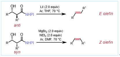 烯烃是天然产物、药物、农药和香料等高价值分子的重要砌块和前驱体,其选择性合成在有机合成中至关重要。目前通过消除过程合成烯烃的方法主要包括 Chugaev 消去, Burgess 消去法Sharpless-Grieco 消去和过渡金属促进消去等。但是这些方法仍然存在一些缺点,例如温度过高、对水氧敏感或者试剂有毒、价格昂贵等。更重要的是,这些方法通常会产生不可分离的 E/Z 异构体混合物。即使是得以广泛应用的 Wittig 反应,依然会不可避免地会产生两种异构体。因此,制备高选择性的 E/Z 异构体的方法具有较大价值,但同时也具有较大的挑战性。