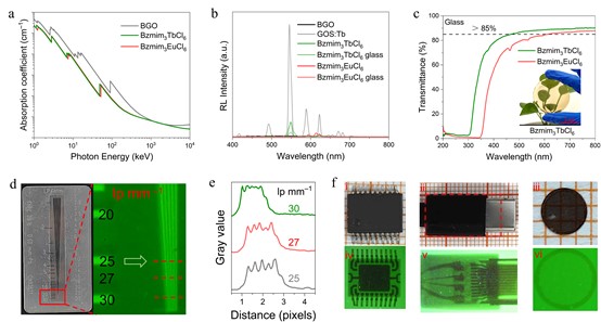 图2. Bzmim3LnCl6玻璃闪烁体的闪烁性能以及X射线成像性能。