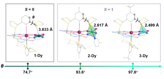 近期,该团队选用刚性的[15-MCNi-5]金属冠醚以及具有σ键旋转潜力的轴向配体对稀土离子进行封装,合成了一系列具有强磁各向异性和精确自旋排列的多自旋单分子磁体{Ln[15-MCNi-5](RDDTP)} (R = H, 1-Ln; R= Me, 2-Ln; R = tBu, 3-Ln; Ln = Dy, Y)。轴向配体取代基的立体电子效应使Ni1位点上方的二硫戊环烷基产生可控的C(sp2)–C(sp3) σ键旋转。随着取代基电子效应的增强,配体的扭转角逐渐增大,使得Ni1···S1距离逐步缩短,Ni1位点呈现出可变的四配位、六配位和五配位的环境。磁性测试表明Ni1位点环境影响其磁各向异性和自旋态,导致1~3-Dy呈现出差异显著的磁滞回线。