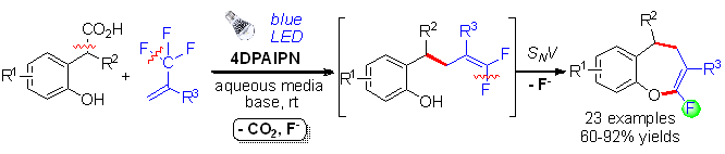 A photocatalytic decarboxylative/defluorinative [4 + 3] annulation of o-hydroxyphenylacetic acids and trifluoromethyl alkenes: synthesis of fluorinated dihydrobenzoxepines.