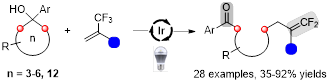 Visible-light-promoted defluorinative ring-opening gem-difluoroallylation of cycloalkanols using 1-trifluoromethyl alkenes.