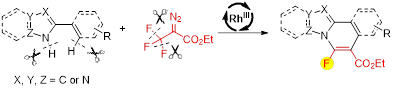 Synthesis of mono-fluorinated heterocycles with a ring-junction nitrogen atom via Rh(III)-catalyzed CF3-carbenoid C–H functionalization and defluorinative annulation.